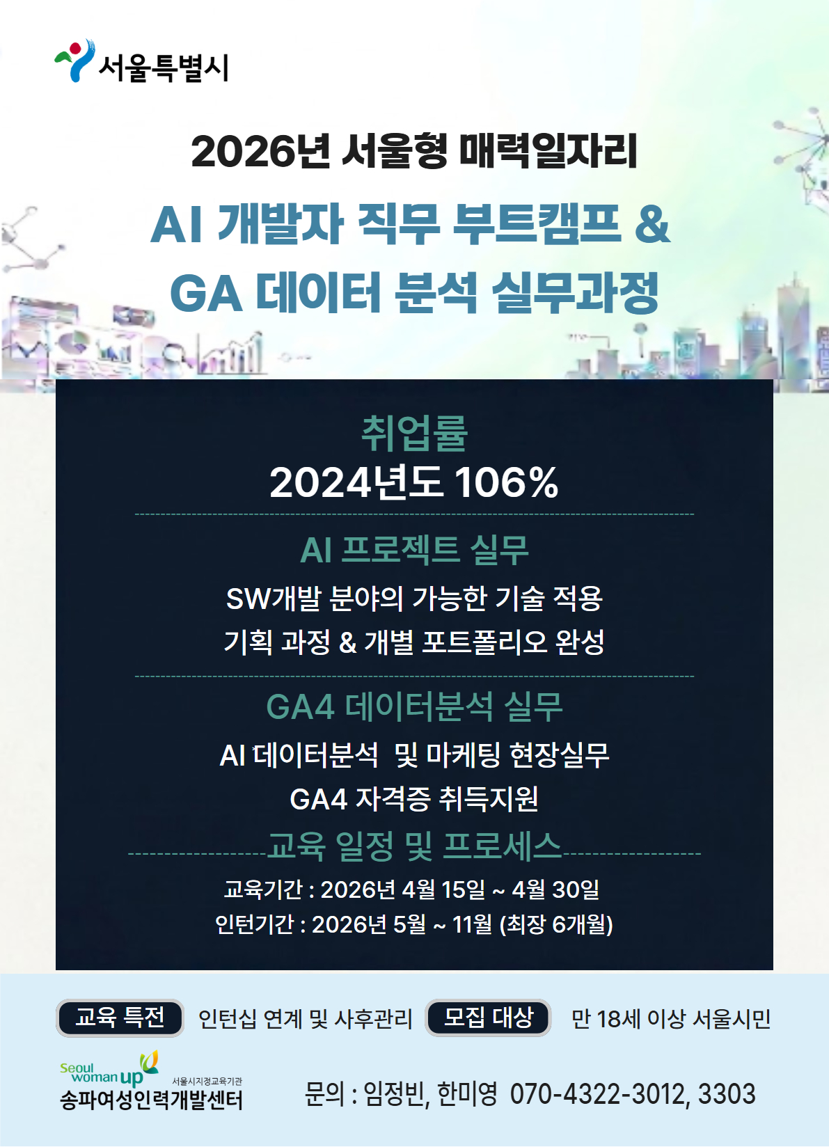 「2026년 서울시 민간단체 협력형 매력일자리 사업」 AI 개발자 직무부트캠프 & GA 데이터분석 실무과정 참여자 모집 공고 |