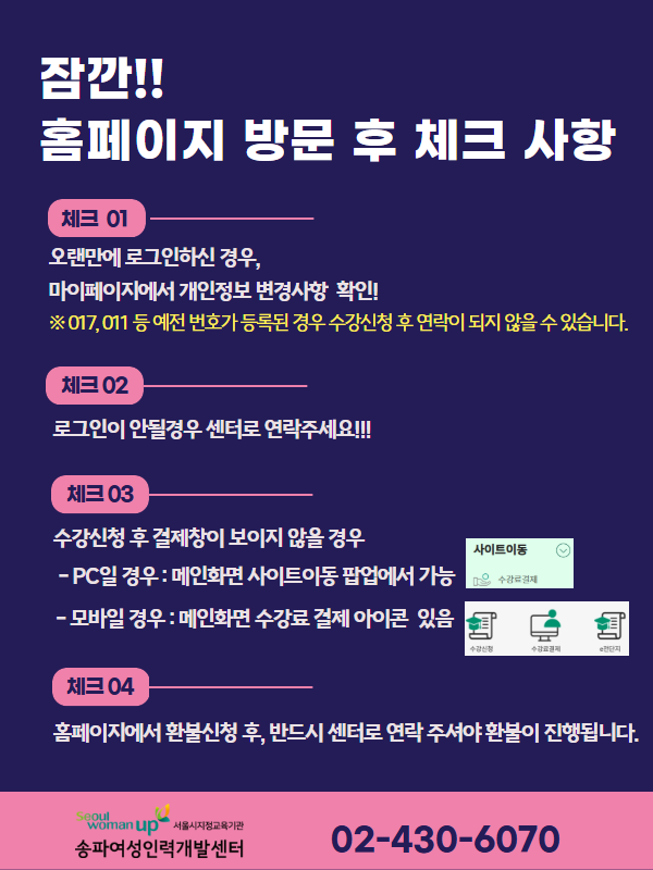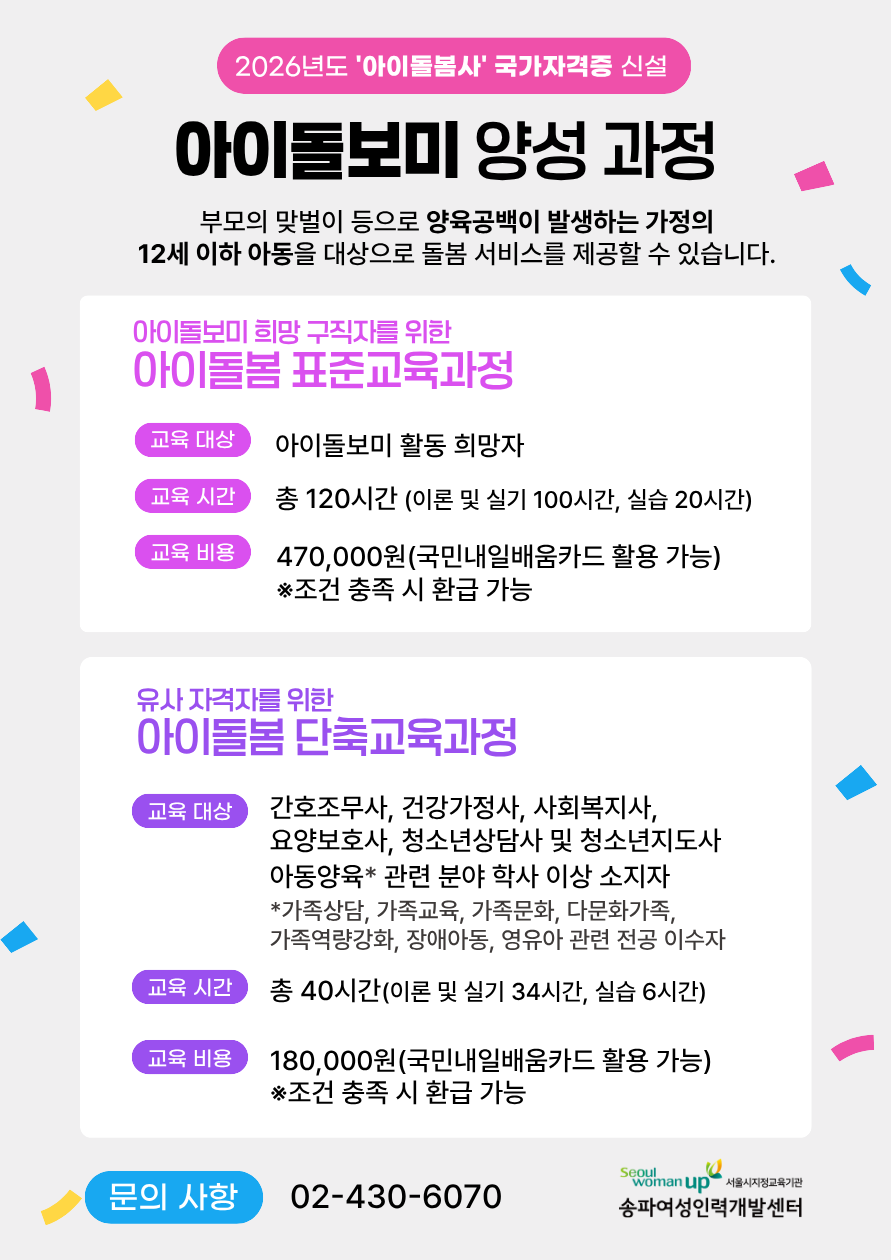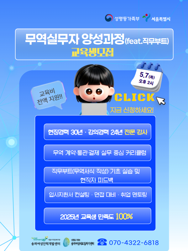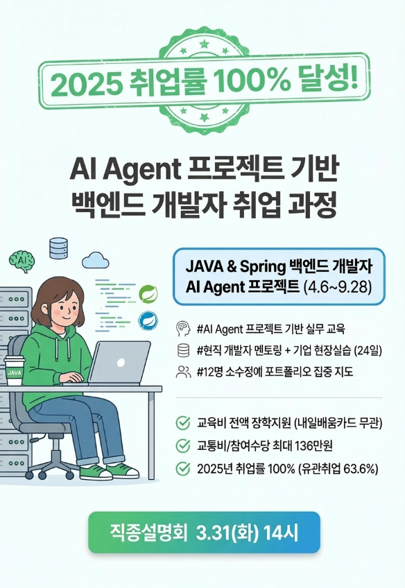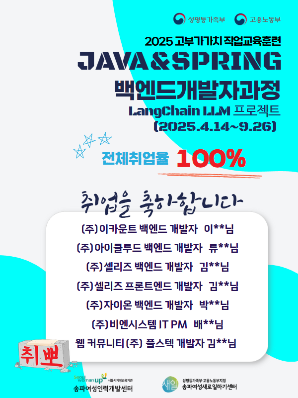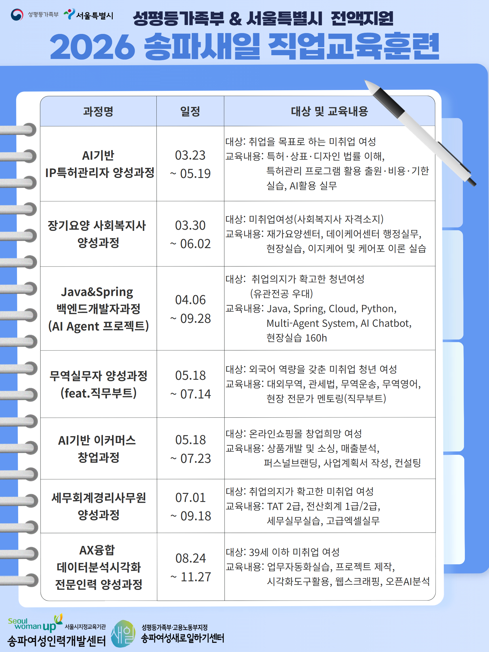 다중 게시판 국/시비지원 [2026 국비지원][직업훈련] AI기반 이커머스 창업과정 [국비지원][직업훈련] 무역실무자 양성과정(feat.직무부트) AX융합데이터분석시각화전문인력양성과정 Java&Spring 백엔드개발자과정(AI Agent 프로젝트) 청년일자리 [구인] 제37회 세계 전기자동차 학술대회 및 전시회 운영요원 구인 [한국PCO협회] 2024년 희망 MICE 인턴십 실습 인턴 모집 [구인] 위엑스포 - 전시회 기획 및 운영자 채용 [구인] 인터컴 - 국제회의 행사지원 계약직(3개월) 채용 [구인] PRIME-C (프라임씨) - 기획팀 신입/경력직 모집 공지사항 2026 민간단체 협력형 매력일자리 사업 [AI 개발자 직무부트캠프 & GA 데이터분석 실무과정] 협력사업장(참여기업) 모집 [구직지원금] 2026년 서울커리업 구직지원금 지원 대상자 1차 모집 공고 [성평등가족부]로펌실무아카데미 참여자 모집 2026 민간단체 협력형 매력일자리 사업 [AI 개발자 직무부트캠프 & GA 데이터분석 실무과정] [성평등가족부 직업훈련] 무역실무자 양성과정 (feat. 직무부트) 센터소식 [취업 성과] 2025 IP특허관리 전문인력 양성과정 수료생 취업 현황 안내 2025년 교육수요조사 당첨자 발표 [취업 성과] 2025 Java&Spring 백엔드개발자과정(LangChain LLM 프로젝트) 수료생 취업 현황 (2026.1.19 업데이트) [협약식]주한프랑스상공회의소(FKCCI)-송파여성인력개발센터(송파여성새로일하기센터) [협약식]해양환경공단-송파여성인력개발센터(송파여성새로일하기센터) 더보기